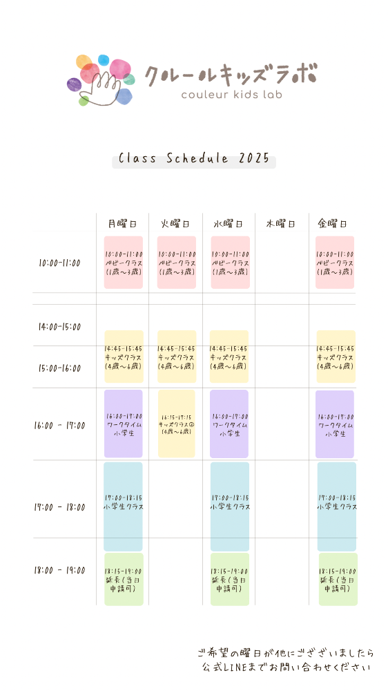 小学生(延長) | コース料金+2000円/月額 (18時15分〜19時 保護者様よりご連絡いただければ 当日受付も可能です。 もっと楽しみたい、保護者様の帰りが遅くなる際にご利用ください。) |